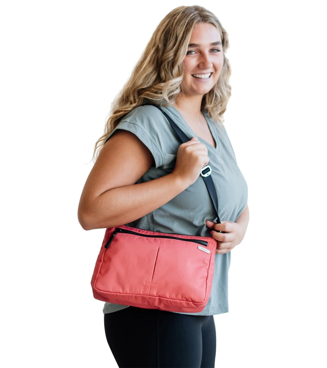 The Aruna Project Shree Crossbody is a water-resistant nylon crossbody bag with two interior and two exterior zip pockets, adjustable strap, and brushed silver metal hardware.