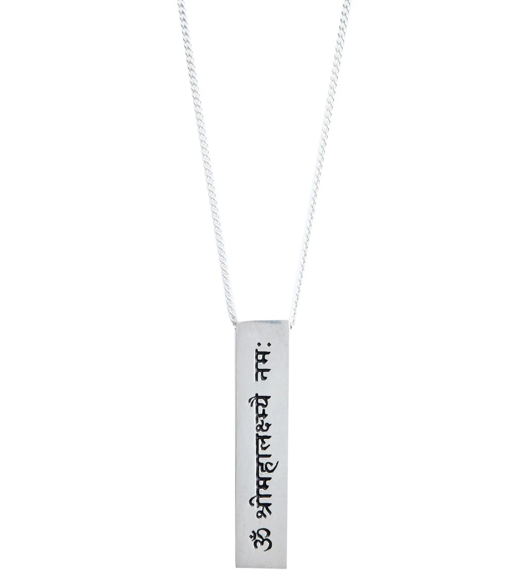 The Mala Collective Lakshmi Vertical Silver Necklace is perfect for any occasion. The Sanskrit mantra honors Lakshmi, the Goddess of wealth, prosperity, fortune, and beauty.