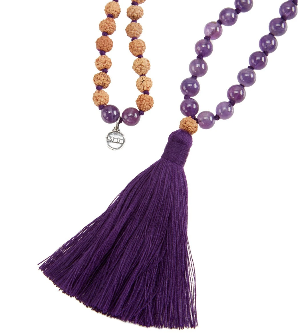 Find your inner peace with the Mala Collective My Practice is Peace Mala Necklace, made with Rudraksha and Lavender Amethyst stones to radiate calmness and stillness.